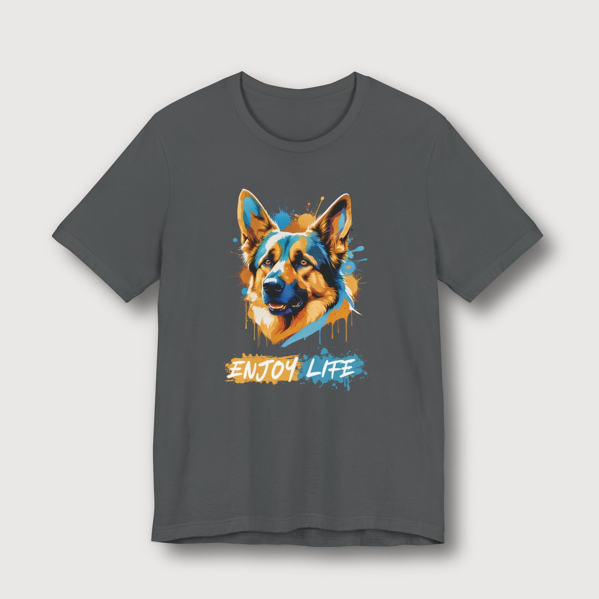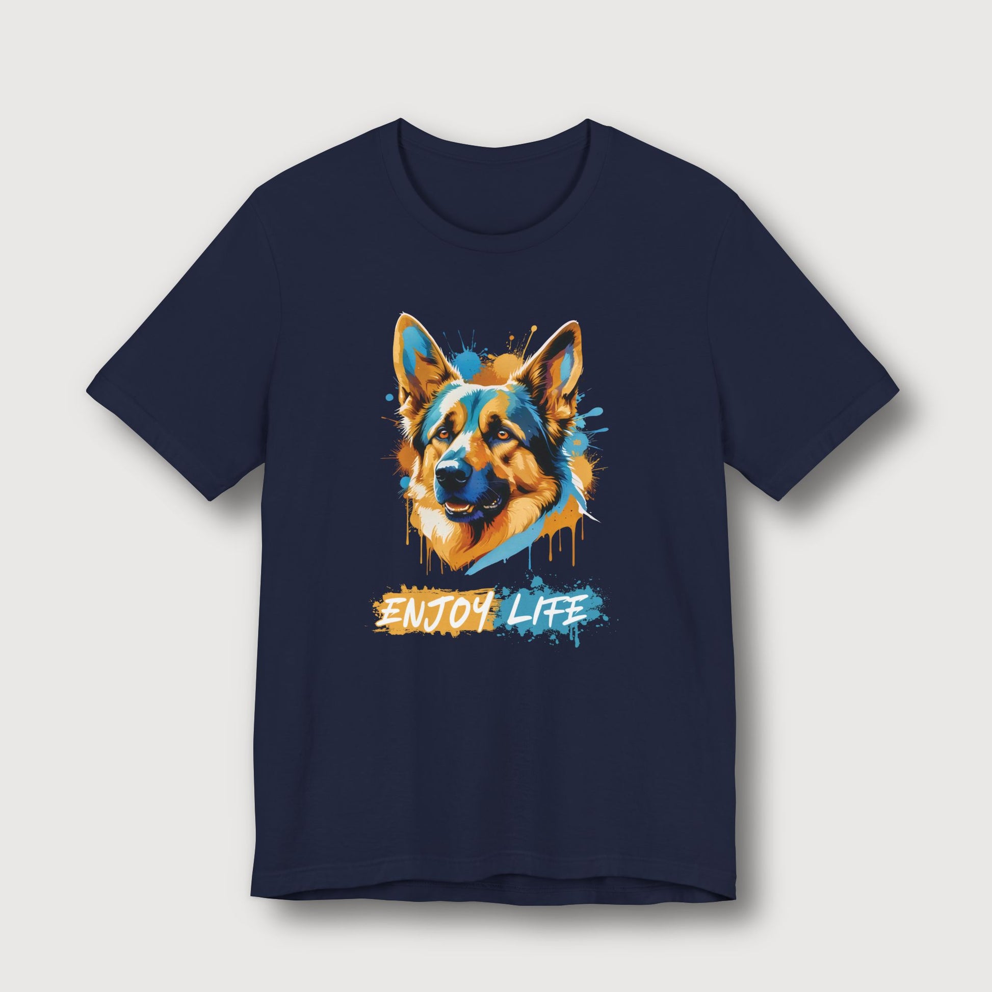Bright, bold, and bursting with good vibes! This t-shirt features a vibrant blue German Shepherd with a graffiti dripping paint effect that screams "Enjoy Life"- because who better to remind you than man’s best friend? This happy pup is here to bring color, joy, and a little street art flair to your wardrobe. Whether you're a dog lover or just someone who believes in living life to the fullest, this tee brings a splash of art and an uplifting message wherever you go.