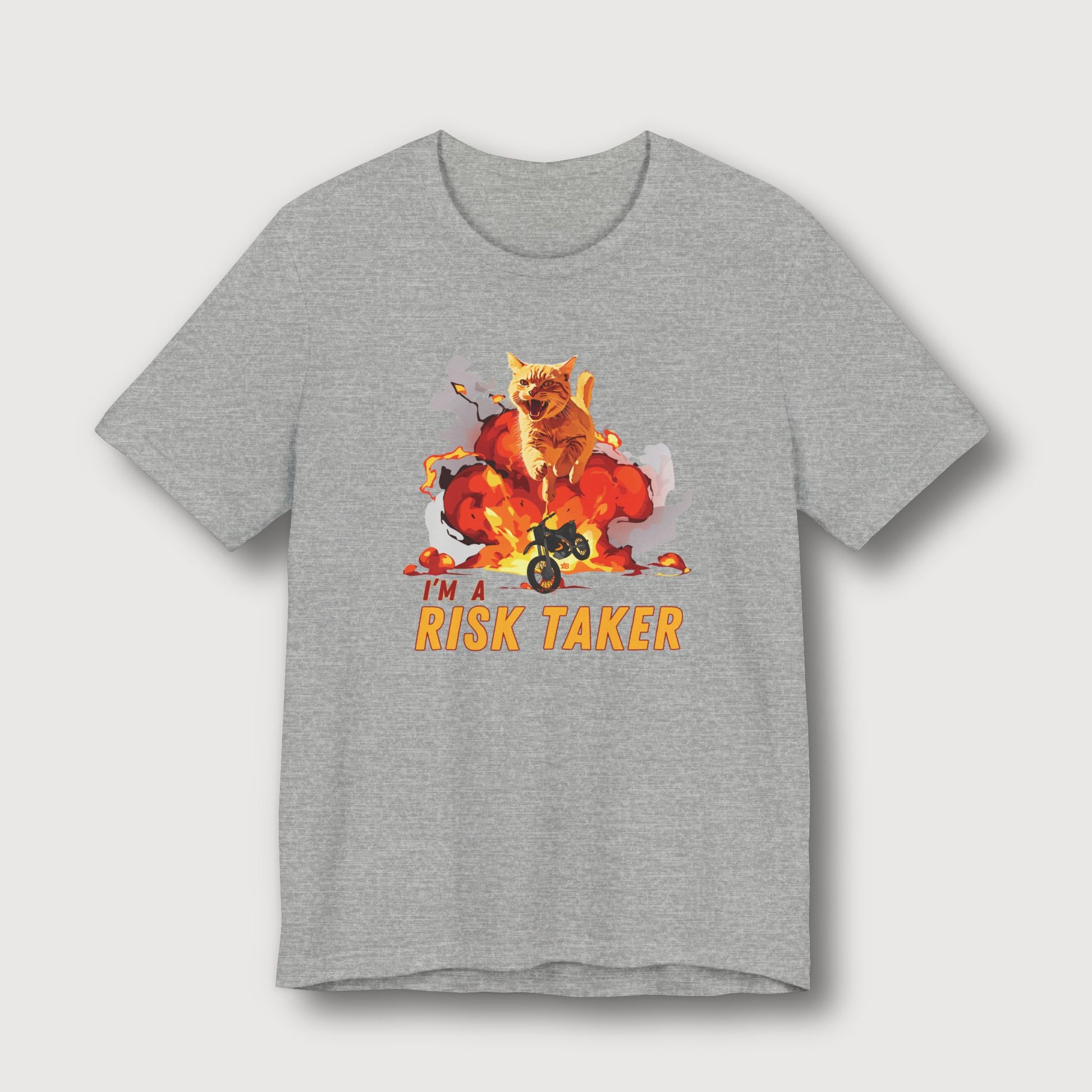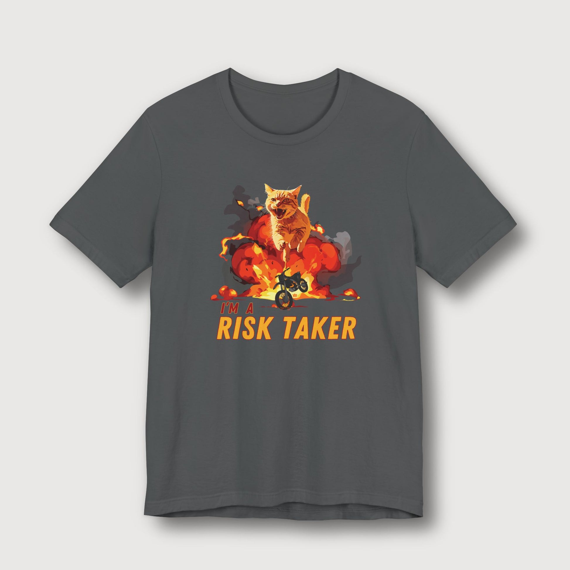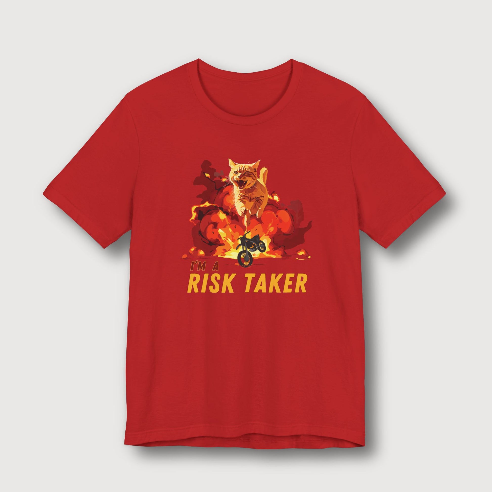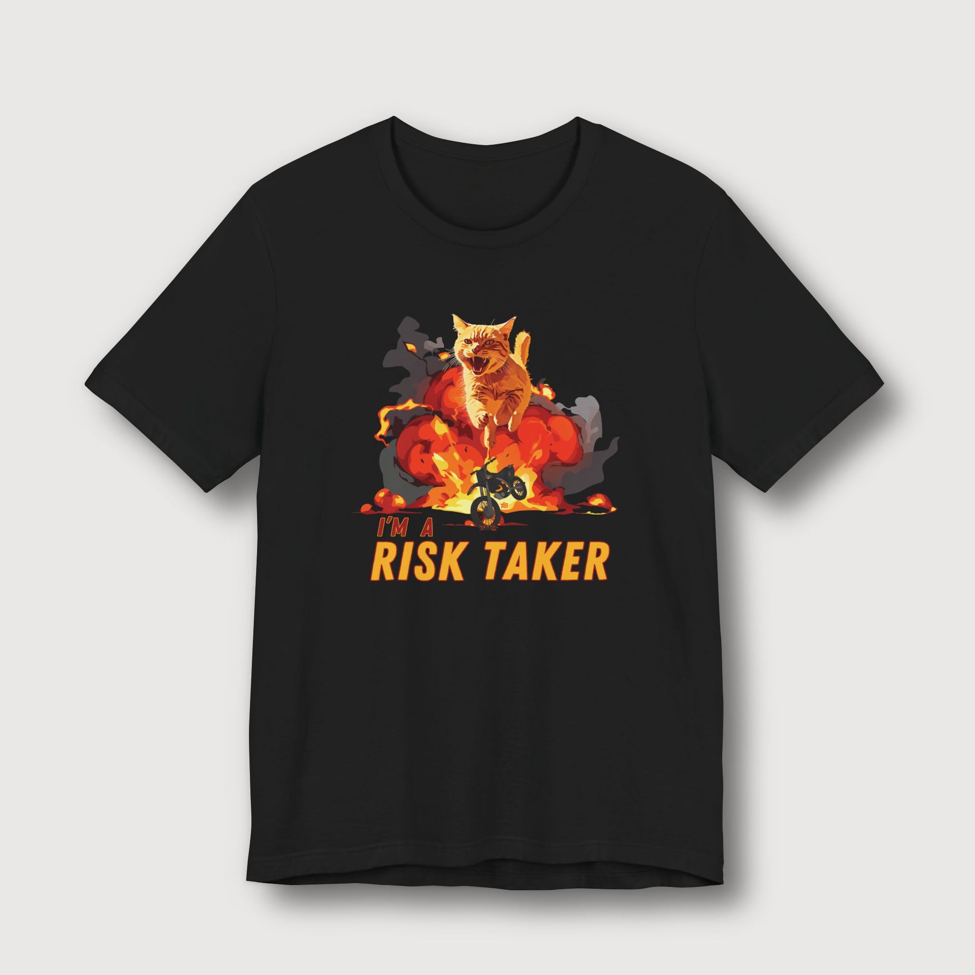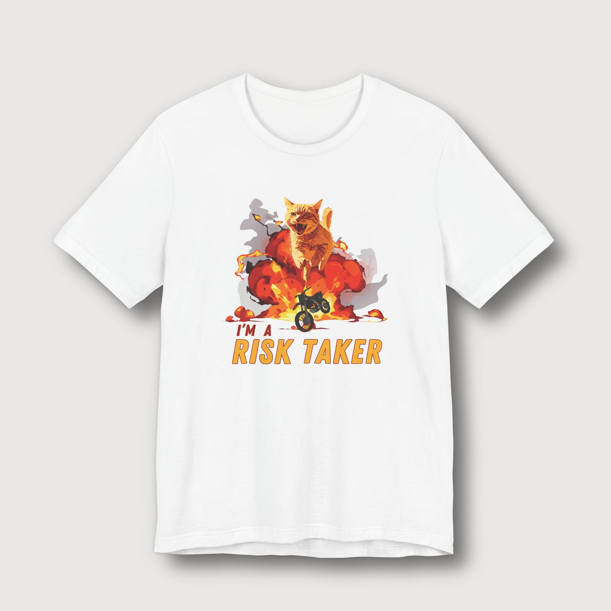 This cat isn’t chasing mice - it’s chasing thrill with style. The "I'm a Risk Taker" tee features a fearless feline mid-air on a motorbike, flying over a full-blown explosion like it’s just another Tuesday. With flames behind and claws ahead, this daredevil furball is the ultimate reminder that life’s too short to play it safe.